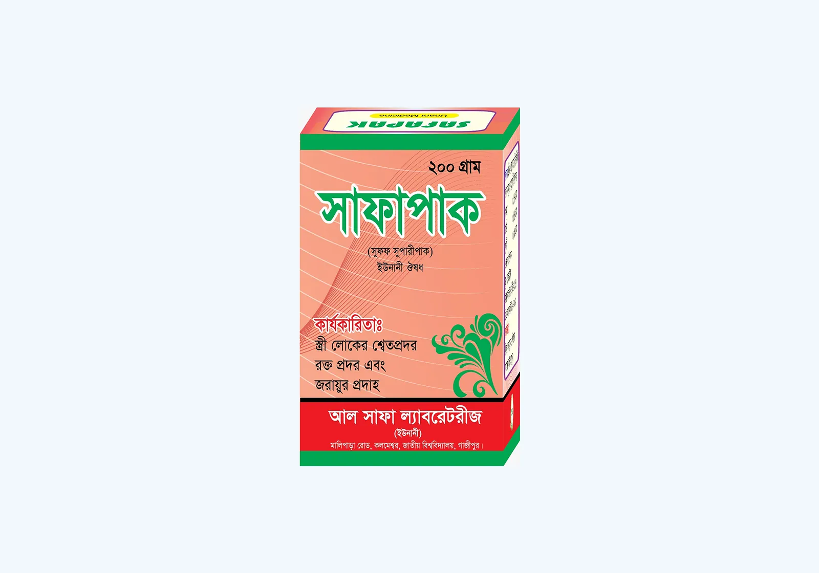সাফাপাক একটি কার্যকর ইউনানী পাউডার ঔষধ যা নারীদের জরায়ু ও প্রজনন অঙ্গের দুর্বলতা দূর করতে সহায়তা করে। এটি শ্বেতপ্রদর ও রক্তপ্রদর নিয়ন্ত্রণে রাখে, অনিয়মিত মাসিক স্বাভাবিক করতে সাহায্য করে এবং গর্ভপাতজনিত দুর্বলতা দূর করে জরায়ুকে শক্তিশালী করে।