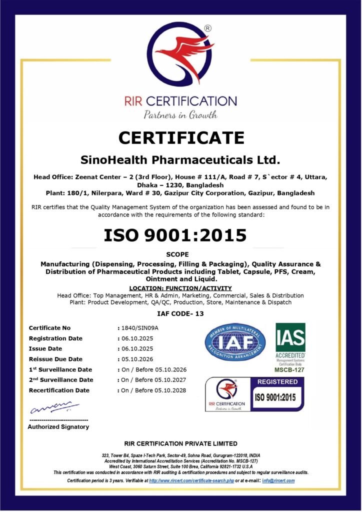 At SinoHealth Pharmaceuticals, we take pride in being officially certified under ISO 9001:2015, the globally recognized standard for Quality Management Systems (QMS).